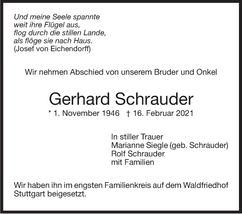Hier finden Sie alle Traueranzeigen aus der Zeitung, die bisher für Gerhard Schrauder erschienen sind. Weitere Traueranzeigen, die in der Zeitung erscheinen, werden hier ebenfalls aufgelistet