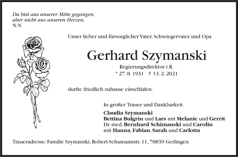 Hier finden Sie alle Traueranzeigen aus der Zeitung, die bisher für Gerhard Szymanski erschienen sind. Weitere Traueranzeigen, die in der Zeitung erscheinen, werden hier ebenfalls aufgelistet
