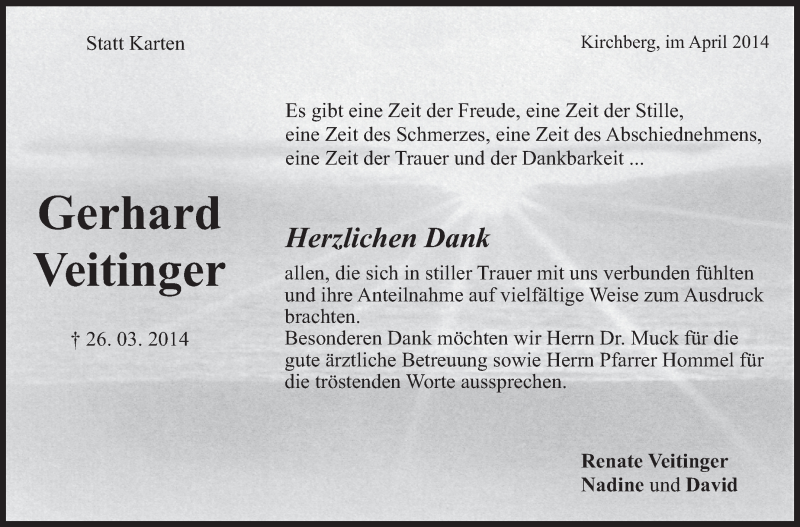 Hier finden Sie alle Traueranzeigen aus der Zeitung, die bisher für Gerhard Veitinger erschienen sind. Weitere Traueranzeigen, die in der Zeitung erscheinen, werden hier ebenfalls aufgelistet