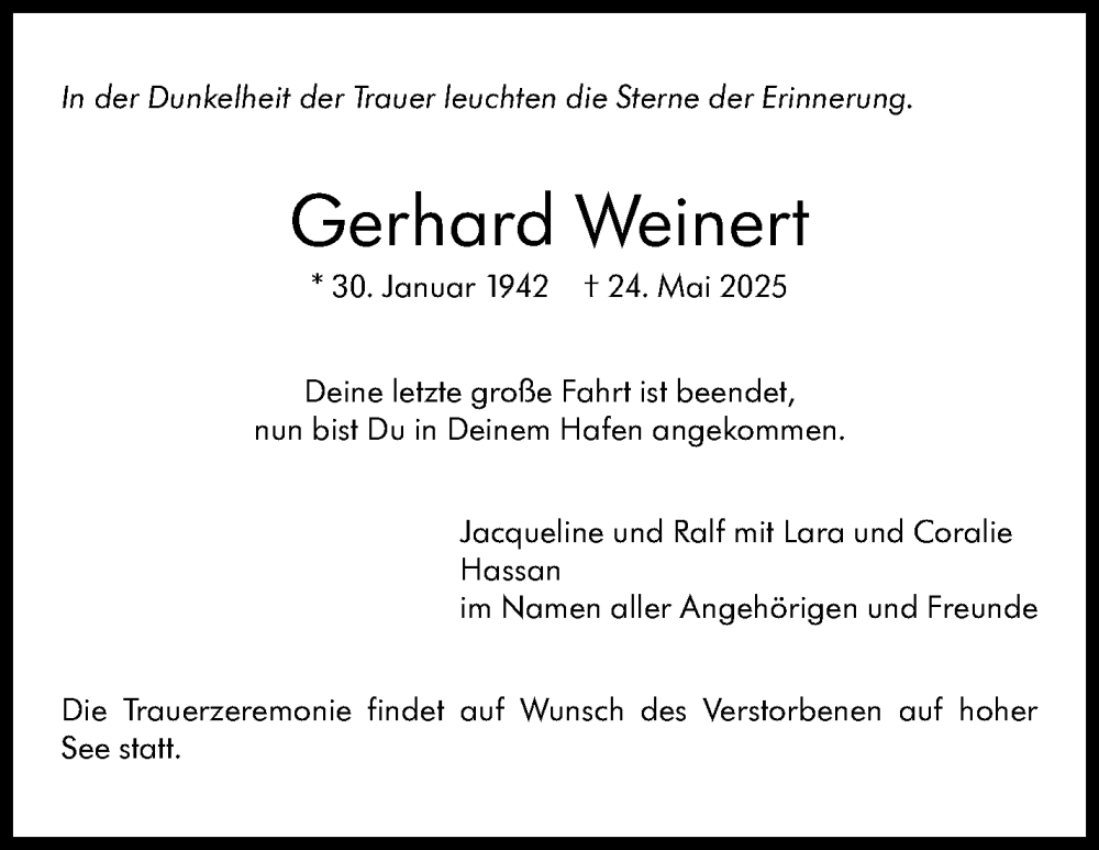 Hier finden Sie alle Traueranzeigen aus der Zeitung, die bisher für Gerhard Weinert erschienen sind. Weitere Traueranzeigen, die in der Zeitung erscheinen, werden hier ebenfalls aufgelistet
