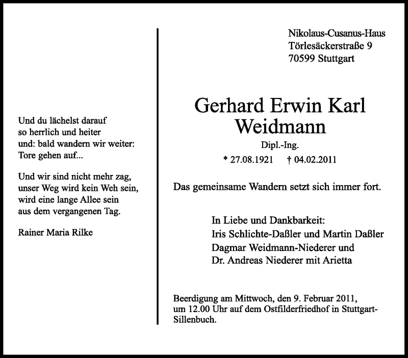 Hier finden Sie alle Traueranzeigen aus der Zeitung, die bisher für Gerhard Erwin Karl Weidmann erschienen sind. Weitere Traueranzeigen, die in der Zeitung erscheinen, werden hier ebenfalls aufgelistet