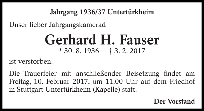 Hier finden Sie alle Traueranzeigen aus der Zeitung, die bisher für Gerhard H. Fauser erschienen sind. Weitere Traueranzeigen, die in der Zeitung erscheinen, werden hier ebenfalls aufgelistet