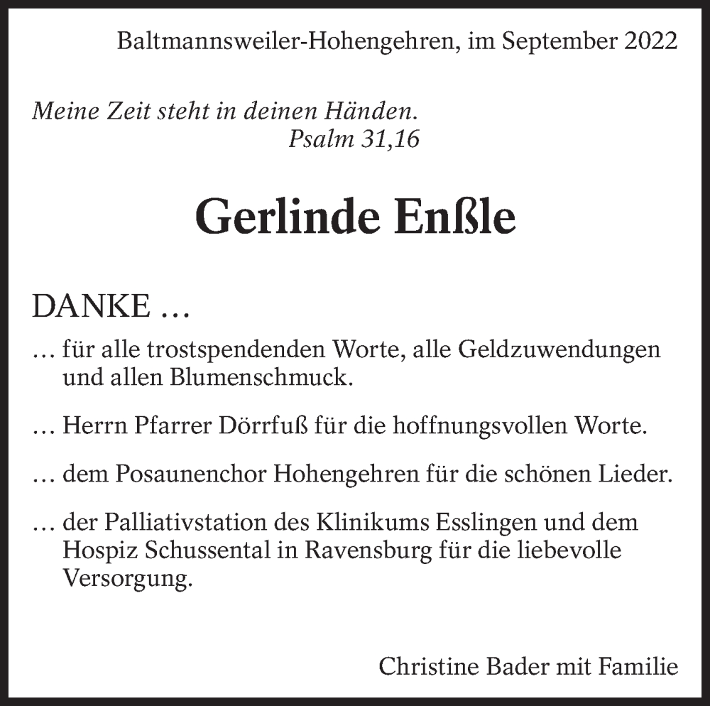 Hier finden Sie alle Traueranzeigen aus der Zeitung, die bisher für Gerlinde Enßle erschienen sind. Weitere Traueranzeigen, die in der Zeitung erscheinen, werden hier ebenfalls aufgelistet