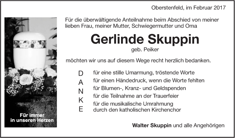 Hier finden Sie alle Traueranzeigen aus der Zeitung, die bisher für Gerlinde Skuppin erschienen sind. Weitere Traueranzeigen, die in der Zeitung erscheinen, werden hier ebenfalls aufgelistet