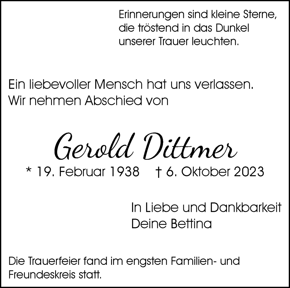 Hier finden Sie alle Traueranzeigen aus der Zeitung, die bisher für Gerold Dittmer erschienen sind. Weitere Traueranzeigen, die in der Zeitung erscheinen, werden hier ebenfalls aufgelistet