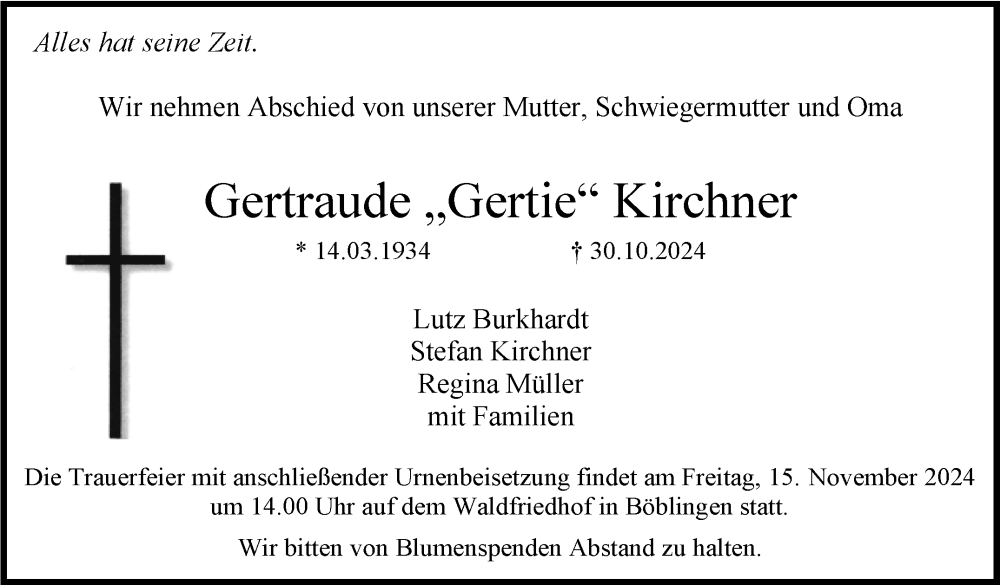 Hier finden Sie alle Traueranzeigen aus der Zeitung, die bisher für Gertraude Kirchner erschienen sind. Weitere Traueranzeigen, die in der Zeitung erscheinen, werden hier ebenfalls aufgelistet