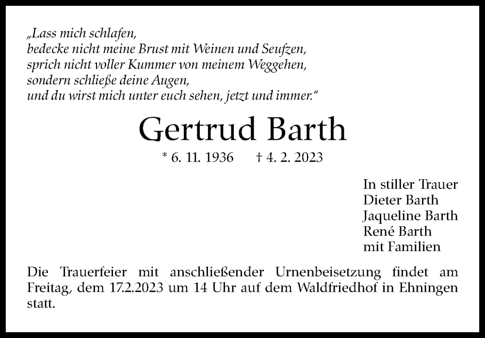 Hier finden Sie alle Traueranzeigen aus der Zeitung, die bisher für Gertrud Barth erschienen sind. Weitere Traueranzeigen, die in der Zeitung erscheinen, werden hier ebenfalls aufgelistet