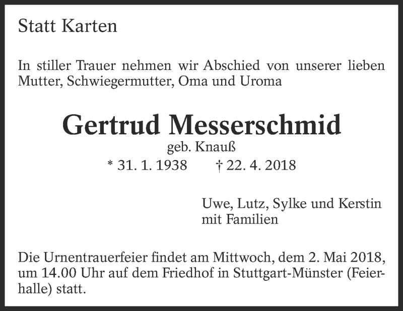Hier finden Sie alle Traueranzeigen aus der Zeitung, die bisher für Gertrud Messerschmid erschienen sind. Weitere Traueranzeigen, die in der Zeitung erscheinen, werden hier ebenfalls aufgelistet