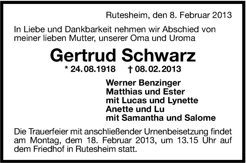 Hier finden Sie alle Traueranzeigen aus der Zeitung, die bisher für Gertrud Schwarz erschienen sind. Weitere Traueranzeigen, die in der Zeitung erscheinen, werden hier ebenfalls aufgelistet