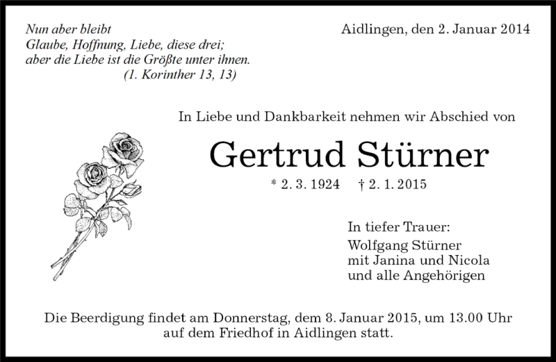 Hier finden Sie alle Traueranzeigen aus der Zeitung, die bisher für Gertrud Stürner erschienen sind. Weitere Traueranzeigen, die in der Zeitung erscheinen, werden hier ebenfalls aufgelistet