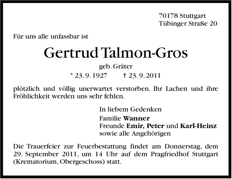 Hier finden Sie alle Traueranzeigen aus der Zeitung, die bisher für Gertrud Talmon-Gros erschienen sind. Weitere Traueranzeigen, die in der Zeitung erscheinen, werden hier ebenfalls aufgelistet
