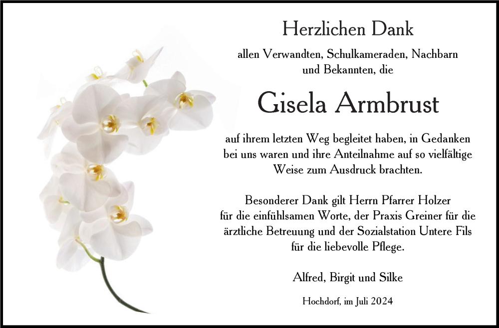 Hier finden Sie alle Traueranzeigen aus der Zeitung, die bisher für Gisela Armbrust erschienen sind. Weitere Traueranzeigen, die in der Zeitung erscheinen, werden hier ebenfalls aufgelistet