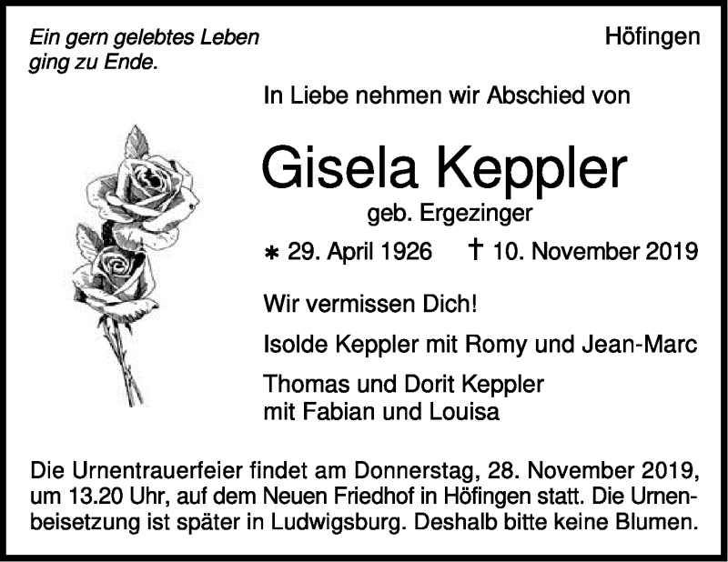 Hier finden Sie alle Traueranzeigen aus der Zeitung, die bisher für Gisela Keppler erschienen sind. Weitere Traueranzeigen, die in der Zeitung erscheinen, werden hier ebenfalls aufgelistet