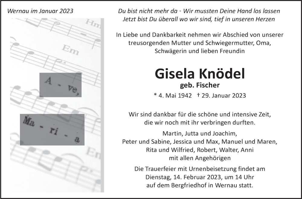 Hier finden Sie alle Traueranzeigen aus der Zeitung, die bisher für Gisela Knödel erschienen sind. Weitere Traueranzeigen, die in der Zeitung erscheinen, werden hier ebenfalls aufgelistet