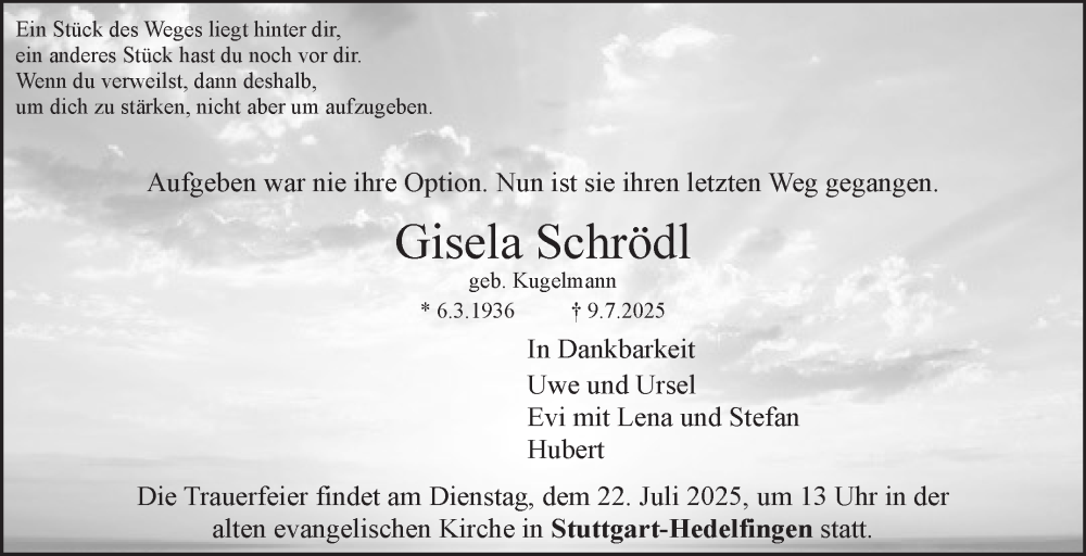 Hier finden Sie alle Traueranzeigen aus der Zeitung, die bisher für Gisela Schrödl erschienen sind. Weitere Traueranzeigen, die in der Zeitung erscheinen, werden hier ebenfalls aufgelistet