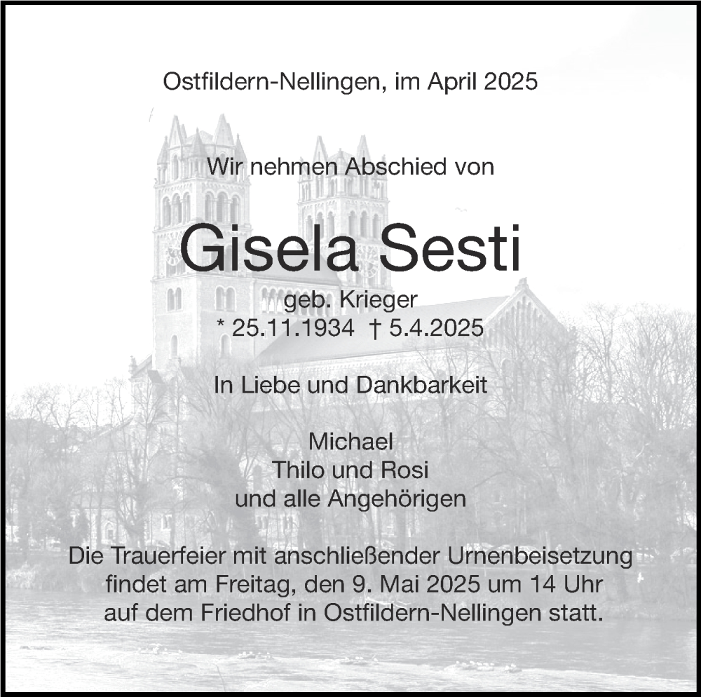 Hier finden Sie alle Traueranzeigen aus der Zeitung, die bisher für Gisela Sesti erschienen sind. Weitere Traueranzeigen, die in der Zeitung erscheinen, werden hier ebenfalls aufgelistet