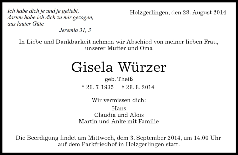 Hier finden Sie alle Traueranzeigen aus der Zeitung, die bisher für Gisela Würzer erschienen sind. Weitere Traueranzeigen, die in der Zeitung erscheinen, werden hier ebenfalls aufgelistet