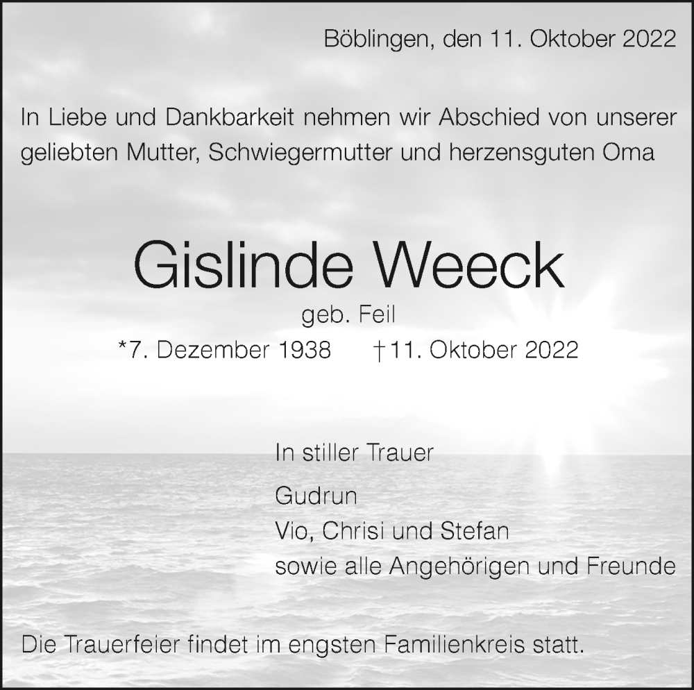 Hier finden Sie alle Traueranzeigen aus der Zeitung, die bisher für Gislinde Weeck erschienen sind. Weitere Traueranzeigen, die in der Zeitung erscheinen, werden hier ebenfalls aufgelistet