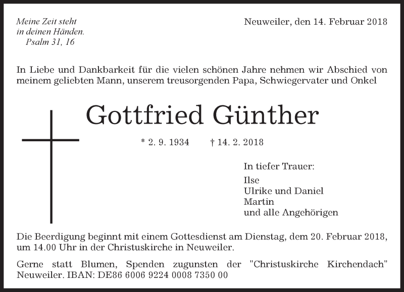 Hier finden Sie alle Traueranzeigen aus der Zeitung, die bisher für Gottfried Günther erschienen sind. Weitere Traueranzeigen, die in der Zeitung erscheinen, werden hier ebenfalls aufgelistet