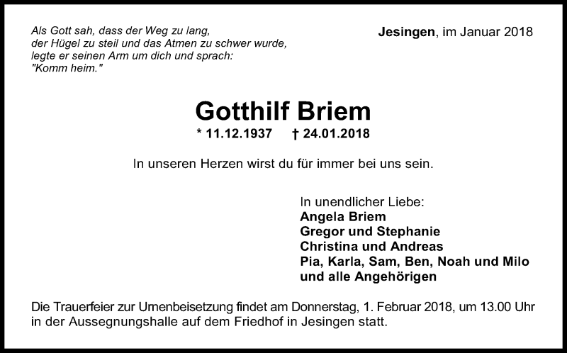 Hier finden Sie alle Traueranzeigen aus der Zeitung, die bisher für Gotthilf Briem erschienen sind. Weitere Traueranzeigen, die in der Zeitung erscheinen, werden hier ebenfalls aufgelistet