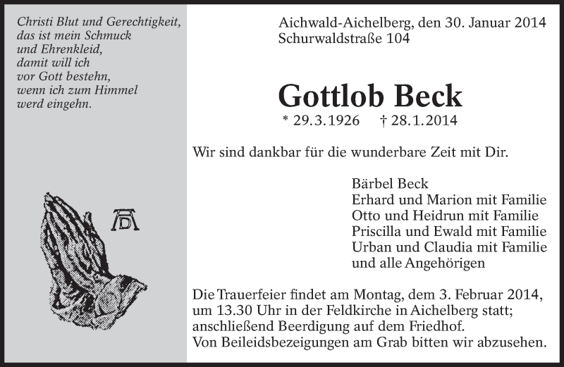 Hier finden Sie alle Traueranzeigen aus der Zeitung, die bisher für Gottlob Beck erschienen sind. Weitere Traueranzeigen, die in der Zeitung erscheinen, werden hier ebenfalls aufgelistet