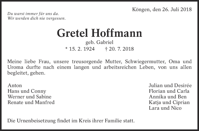 Hier finden Sie alle Traueranzeigen aus der Zeitung, die bisher für Gretel Hoffmann erschienen sind. Weitere Traueranzeigen, die in der Zeitung erscheinen, werden hier ebenfalls aufgelistet