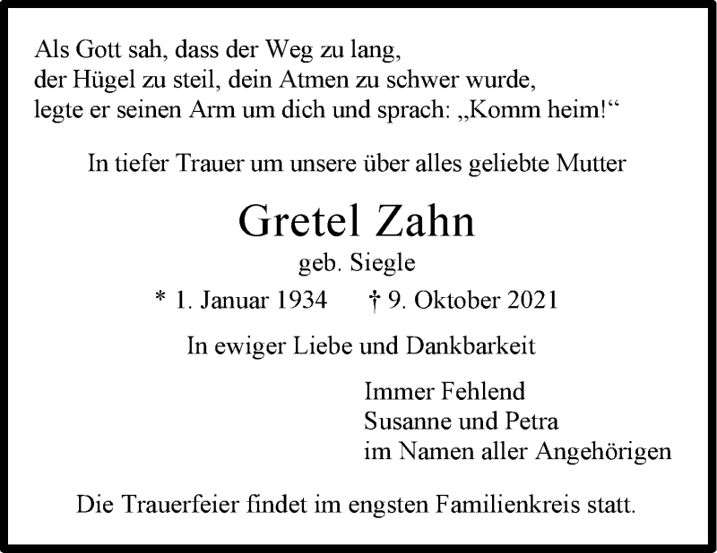 Hier finden Sie alle Traueranzeigen aus der Zeitung, die bisher für Gretel Zahn erschienen sind. Weitere Traueranzeigen, die in der Zeitung erscheinen, werden hier ebenfalls aufgelistet