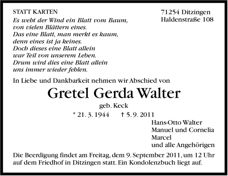 Hier finden Sie alle Traueranzeigen aus der Zeitung, die bisher für Gretel Gerda Walter erschienen sind. Weitere Traueranzeigen, die in der Zeitung erscheinen, werden hier ebenfalls aufgelistet