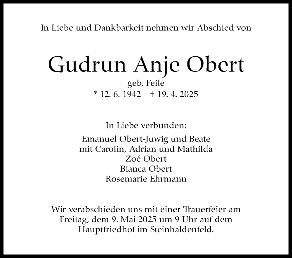 Hier finden Sie alle Traueranzeigen aus der Zeitung, die bisher für Gudrun Anje Obert erschienen sind. Weitere Traueranzeigen, die in der Zeitung erscheinen, werden hier ebenfalls aufgelistet
