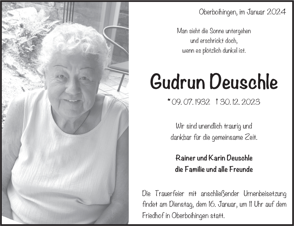 Hier finden Sie alle Traueranzeigen aus der Zeitung, die bisher für Gudrun Deuschle erschienen sind. Weitere Traueranzeigen, die in der Zeitung erscheinen, werden hier ebenfalls aufgelistet