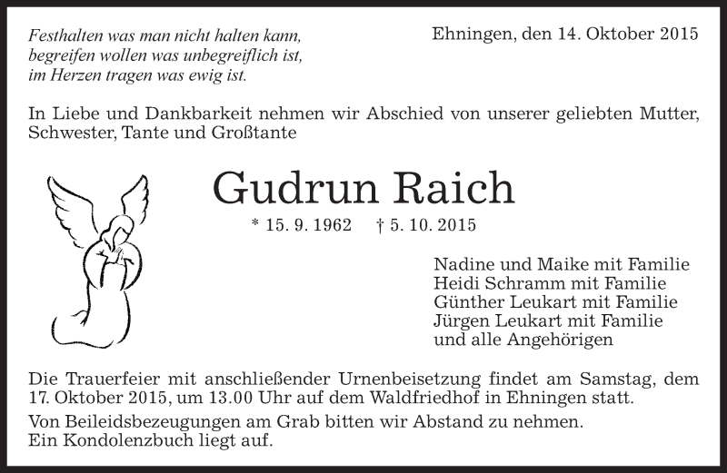Hier finden Sie alle Traueranzeigen aus der Zeitung, die bisher für Gudrun Raich erschienen sind. Weitere Traueranzeigen, die in der Zeitung erscheinen, werden hier ebenfalls aufgelistet