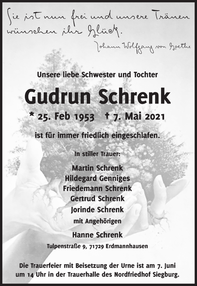 Hier finden Sie alle Traueranzeigen aus der Zeitung, die bisher für Gudrun Schrenk erschienen sind. Weitere Traueranzeigen, die in der Zeitung erscheinen, werden hier ebenfalls aufgelistet