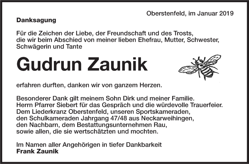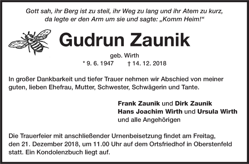 Hier finden Sie alle Traueranzeigen aus der Zeitung, die bisher für Gudrun Zaunik erschienen sind. Weitere Traueranzeigen, die in der Zeitung erscheinen, werden hier ebenfalls aufgelistet