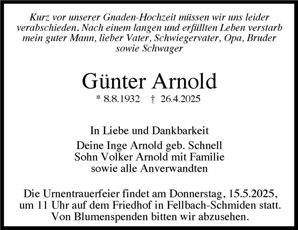 Hier finden Sie alle Traueranzeigen aus der Zeitung, die bisher für Günter Arnold erschienen sind. Weitere Traueranzeigen, die in der Zeitung erscheinen, werden hier ebenfalls aufgelistet