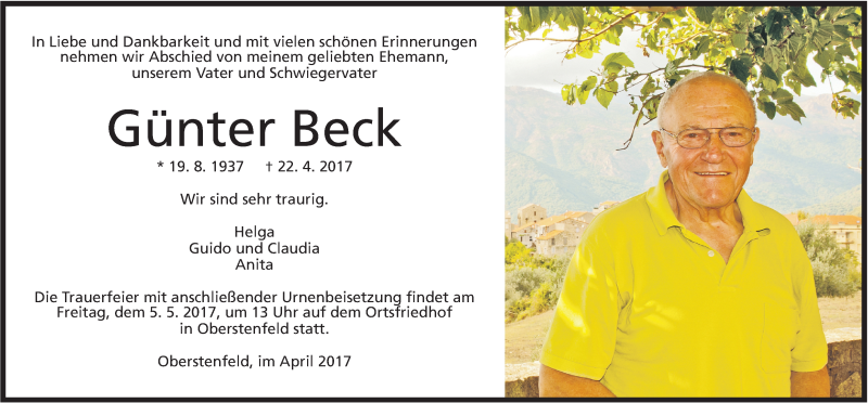 Hier finden Sie alle Traueranzeigen aus der Zeitung, die bisher für Günter Beck erschienen sind. Weitere Traueranzeigen, die in der Zeitung erscheinen, werden hier ebenfalls aufgelistet