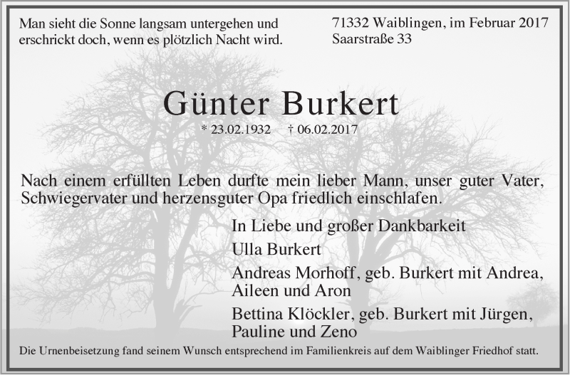 Hier finden Sie alle Traueranzeigen aus der Zeitung, die bisher für Günter Burkert erschienen sind. Weitere Traueranzeigen, die in der Zeitung erscheinen, werden hier ebenfalls aufgelistet