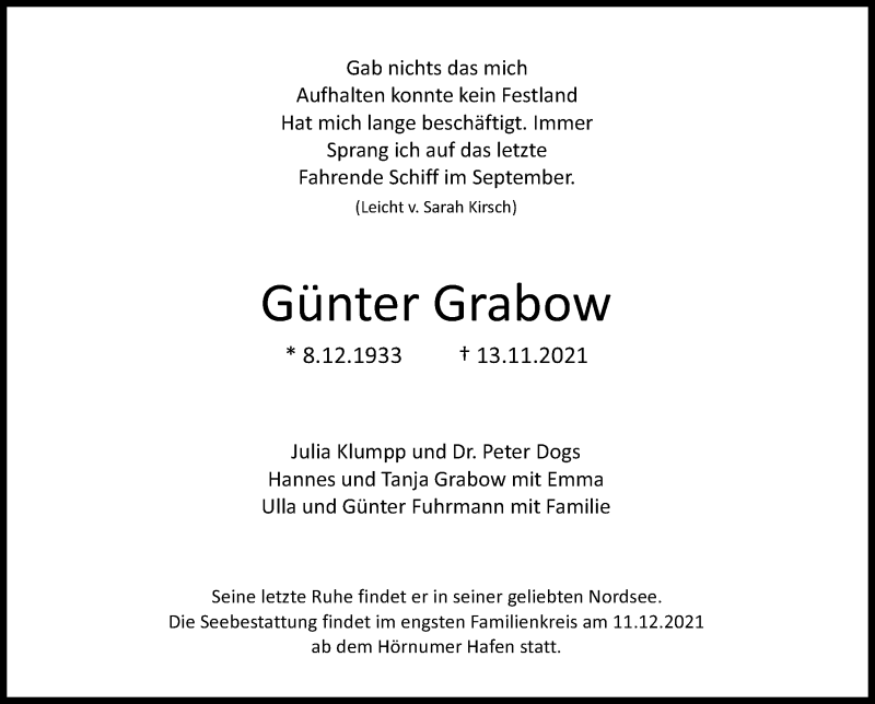 Hier finden Sie alle Traueranzeigen aus der Zeitung, die bisher für Günter Grabow erschienen sind. Weitere Traueranzeigen, die in der Zeitung erscheinen, werden hier ebenfalls aufgelistet