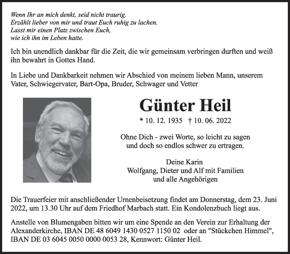 Hier finden Sie alle Traueranzeigen aus der Zeitung, die bisher für Günter Heil erschienen sind. Weitere Traueranzeigen, die in der Zeitung erscheinen, werden hier ebenfalls aufgelistet