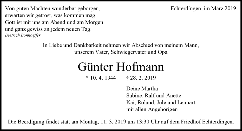 Hier finden Sie alle Traueranzeigen aus der Zeitung, die bisher für Günter Hofmann erschienen sind. Weitere Traueranzeigen, die in der Zeitung erscheinen, werden hier ebenfalls aufgelistet