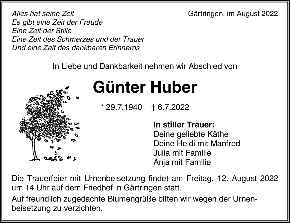 Hier finden Sie alle Traueranzeigen aus der Zeitung, die bisher für Günter Huber erschienen sind. Weitere Traueranzeigen, die in der Zeitung erscheinen, werden hier ebenfalls aufgelistet