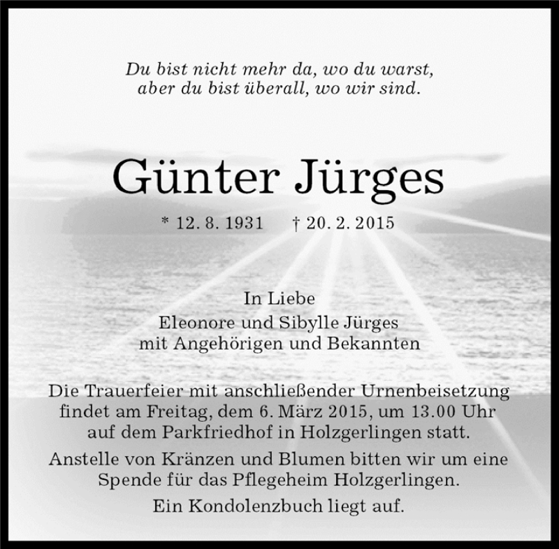 Hier finden Sie alle Traueranzeigen aus der Zeitung, die bisher für Günter Jürges erschienen sind. Weitere Traueranzeigen, die in der Zeitung erscheinen, werden hier ebenfalls aufgelistet