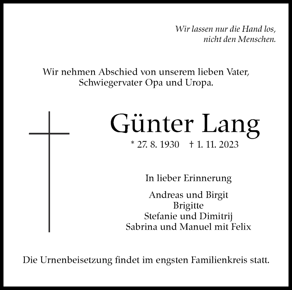 Hier finden Sie alle Traueranzeigen aus der Zeitung, die bisher für Günter Lang erschienen sind. Weitere Traueranzeigen, die in der Zeitung erscheinen, werden hier ebenfalls aufgelistet