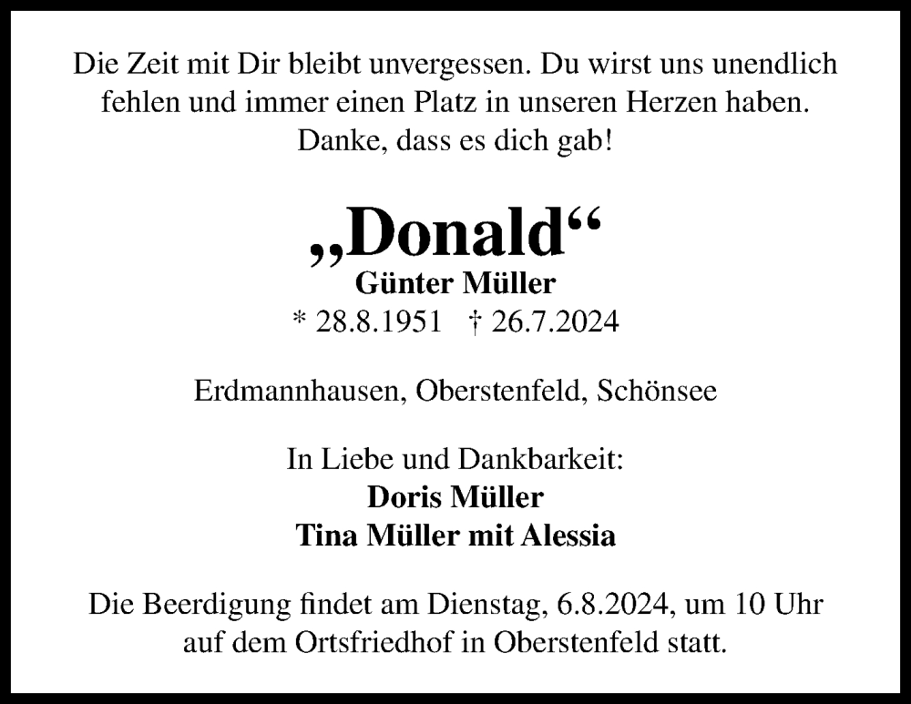 Hier finden Sie alle Traueranzeigen aus der Zeitung, die bisher für Günter Müller erschienen sind. Weitere Traueranzeigen, die in der Zeitung erscheinen, werden hier ebenfalls aufgelistet