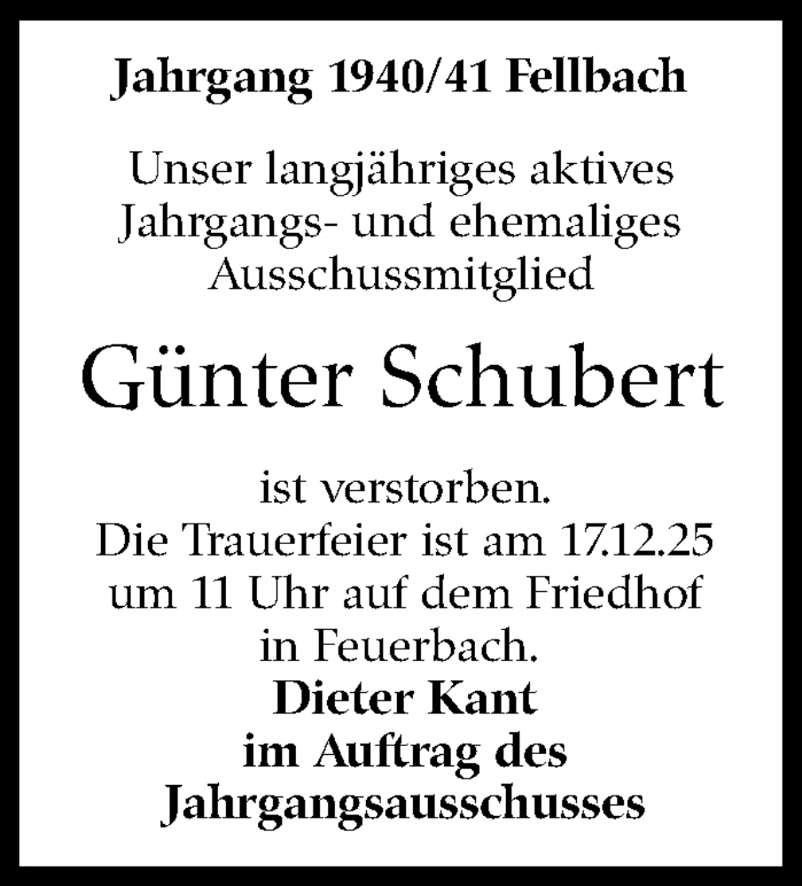 Hier finden Sie alle Traueranzeigen aus der Zeitung, die bisher für Günter Schubert erschienen sind. Weitere Traueranzeigen, die in der Zeitung erscheinen, werden hier ebenfalls aufgelistet
