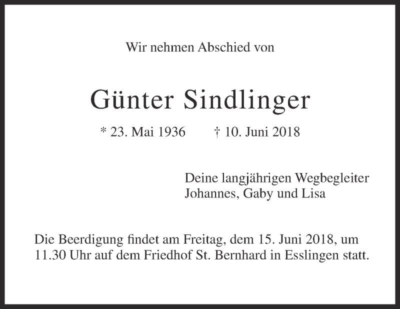 Hier finden Sie alle Traueranzeigen aus der Zeitung, die bisher für Günter Sindlinger erschienen sind. Weitere Traueranzeigen, die in der Zeitung erscheinen, werden hier ebenfalls aufgelistet