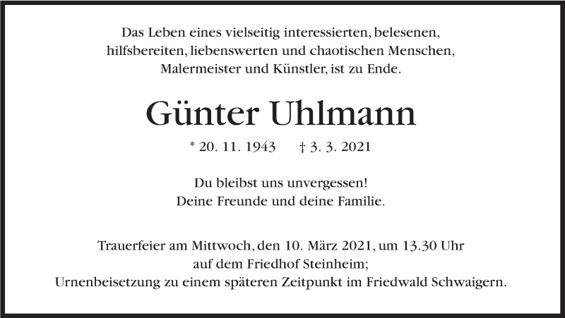 Hier finden Sie alle Traueranzeigen aus der Zeitung, die bisher für Günter Uhlmann erschienen sind. Weitere Traueranzeigen, die in der Zeitung erscheinen, werden hier ebenfalls aufgelistet