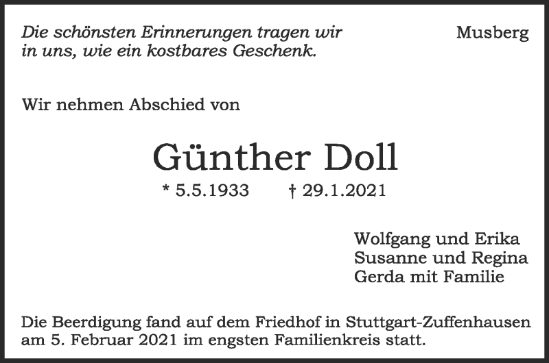 Hier finden Sie alle Traueranzeigen aus der Zeitung, die bisher für Günther Doll erschienen sind. Weitere Traueranzeigen, die in der Zeitung erscheinen, werden hier ebenfalls aufgelistet