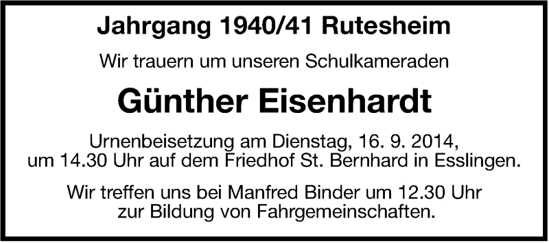 Hier finden Sie alle Traueranzeigen aus der Zeitung, die bisher für Günther Eisenhardt erschienen sind. Weitere Traueranzeigen, die in der Zeitung erscheinen, werden hier ebenfalls aufgelistet
