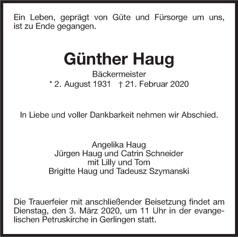 Hier finden Sie alle Traueranzeigen aus der Zeitung, die bisher für Günther Haug erschienen sind. Weitere Traueranzeigen, die in der Zeitung erscheinen, werden hier ebenfalls aufgelistet