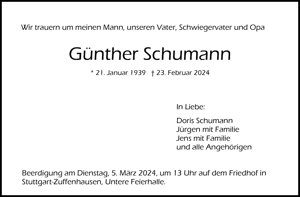 Hier finden Sie alle Traueranzeigen aus der Zeitung, die bisher für Günther Schumann erschienen sind. Weitere Traueranzeigen, die in der Zeitung erscheinen, werden hier ebenfalls aufgelistet